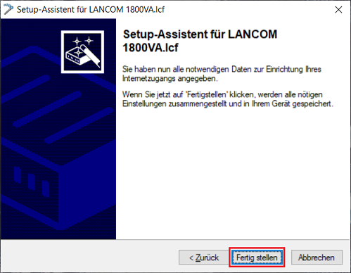 8. Beenden Sie den Setup-Assistenten zur Einrichtung der Internet-Verbindung mit der Schaltfläche Fertig stellen. Die konfigurierten Werte werden dann in den LANCOM Router geschrieben.