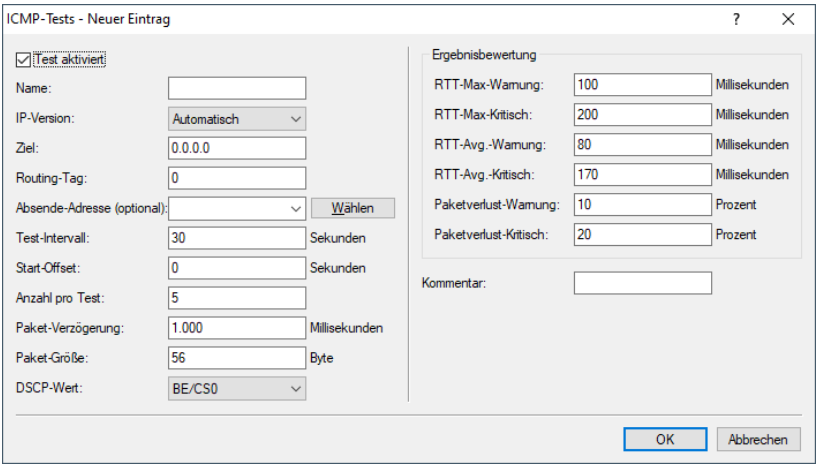 - RTT-Max-Kritisch: Definieren Sie eine maximale Paketumlaufzeit, nach der eine Fehlermeldung generiert wird, falls eines der ICMP-Pakete eine längere Umlaufzeit als die hier festgelegte benötigt.