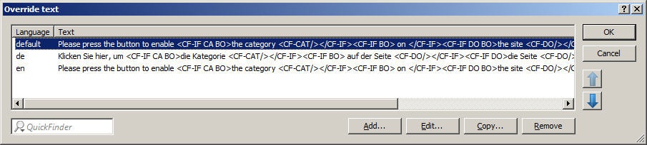 The country code must match the browser language setting exactly, e,g, "de-DE" must be entered for German ("de" on its own is not sufficient). If the country code set in the browser is not found in this table, or if the text stored under that country code is deleted, the predefined default text ("default") will be used. You can modify the default text.