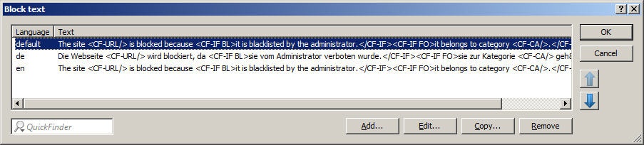 This is where you can define text to be displayed when blocking or an error occurs. Different blocking or error texts can be defined for different languages. The display of blocking text is controlled by the language setting transmitted by the browser (user agent).