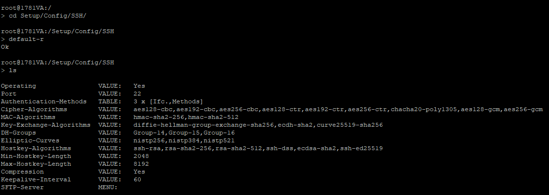 1.1) From the command line, connect to the first device (in this case a 1781VA) and check the encryption settings by entering the command ls /Setup/Config/SSH.