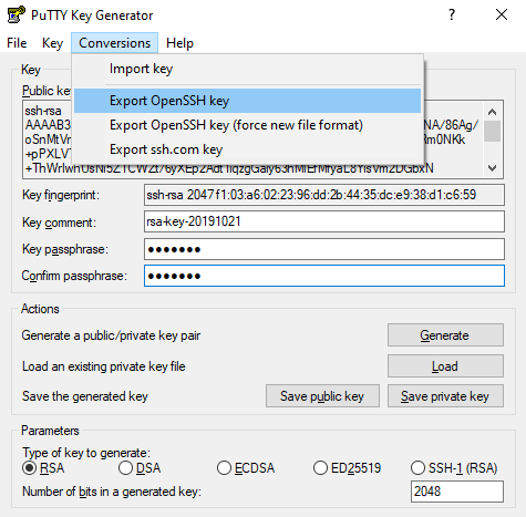 3.2.3) Export the SSH key by clicking on Conversions -> Export OpenSSH key.