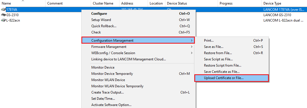 3.2.4) Open LANconfig and right-click on the device to which you want to upload the SSH key.