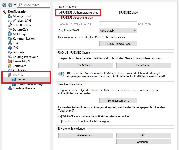 1.1 Wechseln Sie in das Menü RADIUS -> Server und setzen den Haken bei RADIUS-Authentisierung aktiv.