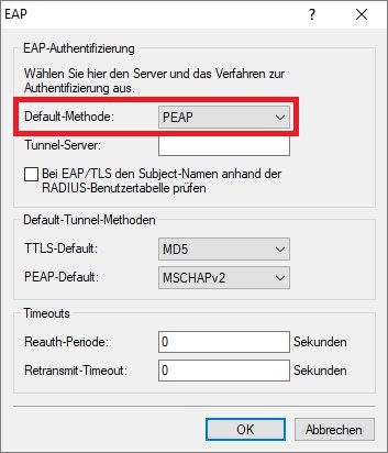 1.5 Ändern Sie die Default-Methode auf PEAP ab, damit die Authentifizierung mit Benutzername und Passwort erfolgt.