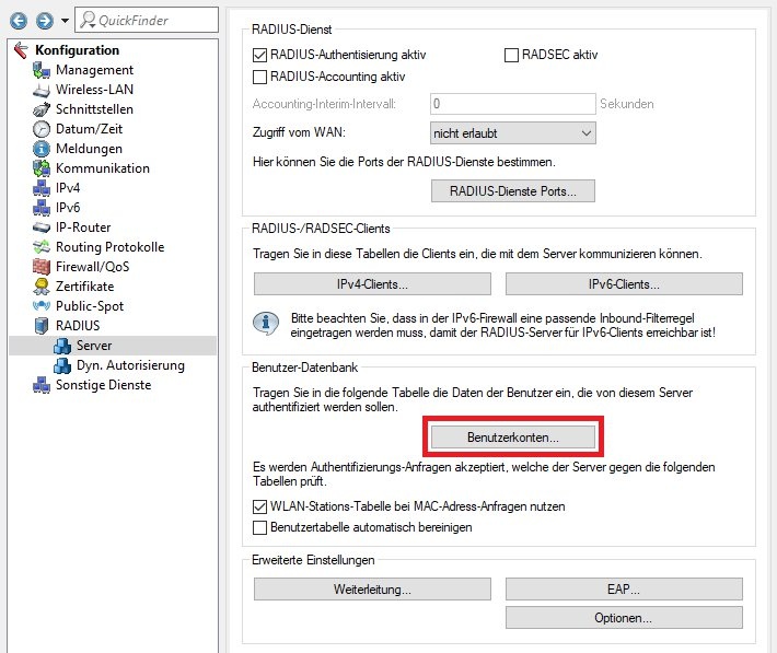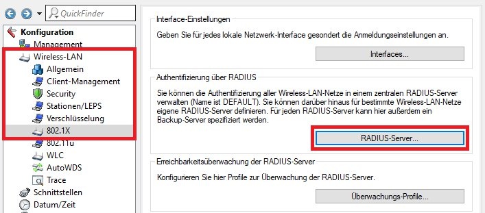 2.2 Öffnen Sie die Konfiguration in LANconfig und wechseln in das Menü Wireless-LAN -> 802.1X -> RADIUS-Server.