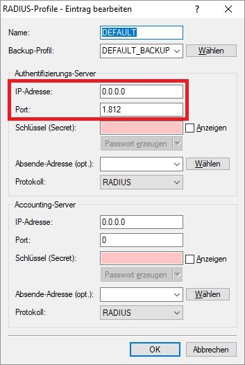 • RADIUS-Profil: Stellen Sie sicher, dass das Profil DEFAULT hinterlegt ist (siehe auch Schritt 3.2)