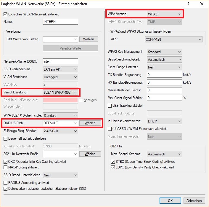 2.6 Öffnen Sie das gewünschte logische WLAN-Interface, wechseln in den Reiter Verschlüsselung und ändern folgende Parameter ab: