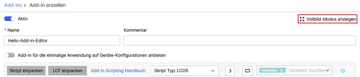 Der Editor kann im Vollbild-Modus verwendet werden, um die volle Übersicht für die Skripterstellung zu erhalten. Klicken Sie dazu auf die Schaltfläche Vollbild-Modus anzeigen in der rechten oberen Ecke und das Menü sowie die Sidebar für die Zuweisung von Variablen werden eingeklappt. Der Editor verwendet anschließend die volle Breite und Höhe der LMC-Webseite.