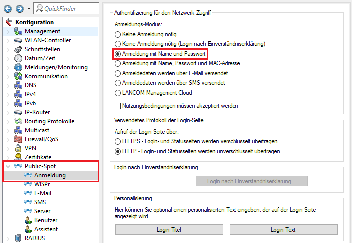 4.1 Wechseln Sie in das Menü Public-Spot → Anmeldung und wählen unter Anmeldungs-Modus die Option Anmeldung mit Name und Passwort aus.