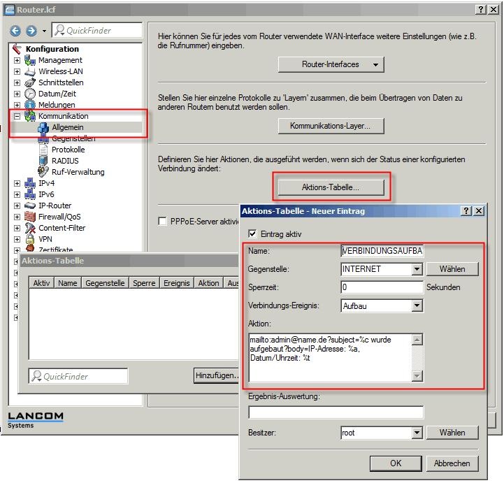 4. Öffnen Sie in der Konfiguration des LANCOM Routers unter Konfiguration -> Kommunikation -> Allgemein die Aktionstabelle und fügen Sie folgenden Eintrag hinzu: